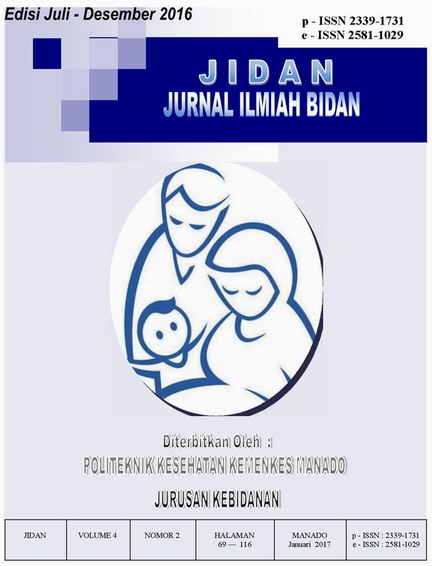 JIDAN Jurnal Ilmiah Bidan, with registered number ISSN 2339-1731(print), 2581-1029(online) is a scientific journal published by Poltekkes Kemenkes Manado. The aim of this journal publication is to disseminate the conceptual thoughts or ideas and research results that have been achieved in the area of midwifery sciences.
