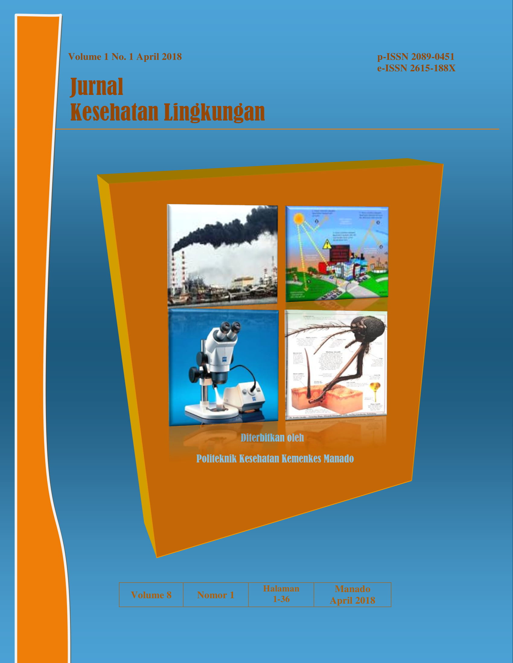 Jurnal Kesehatan Lingkungan (JKL) is media information and research result in the field of environmental health, such as Appropriate Technology Environmental Health, Waste Treatment, Water Sanitations, Air Pollution, Waste Management, Occupational Health, Environment Parasitology, Health Entomology, Vector and pest Control, Microbiology and Environmental Epidemiology. The journal is publish by Poltekkes Kemenkes Manado Ministry of Health of the Republic of Indonesia. Published 2 time a year (April and October). There is no charge for submitted manuscript as well as processing manuscript . The journal has been registered with e-ISSN : 2615-188X and p-ISSN 2089-0451.