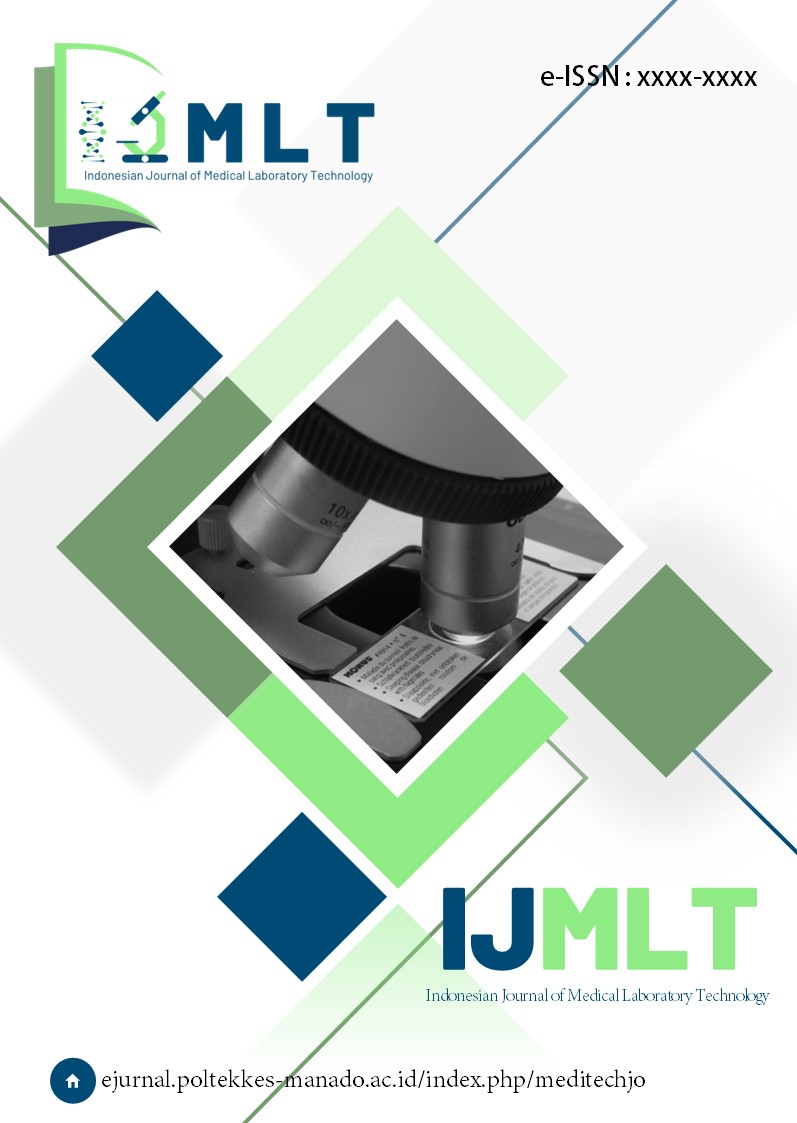 Indonesian Journal of Medical Laboratory Technology (IJMLT) is a scientific journal published by the Poltekkes Kemenkes Manado. Indonesian Journal of Medical Laboratory Technology (IJMLT) contains health research related to the fields of Biomedical, Molecular Biology, Immunoserology, Hematology, Clinical Chemistry, Bacteriology, Parasitology, Mycology, Toxicology, Cytohistechnology, and Biochemistry. Posts received are expected to follow developments/trends of health problems.