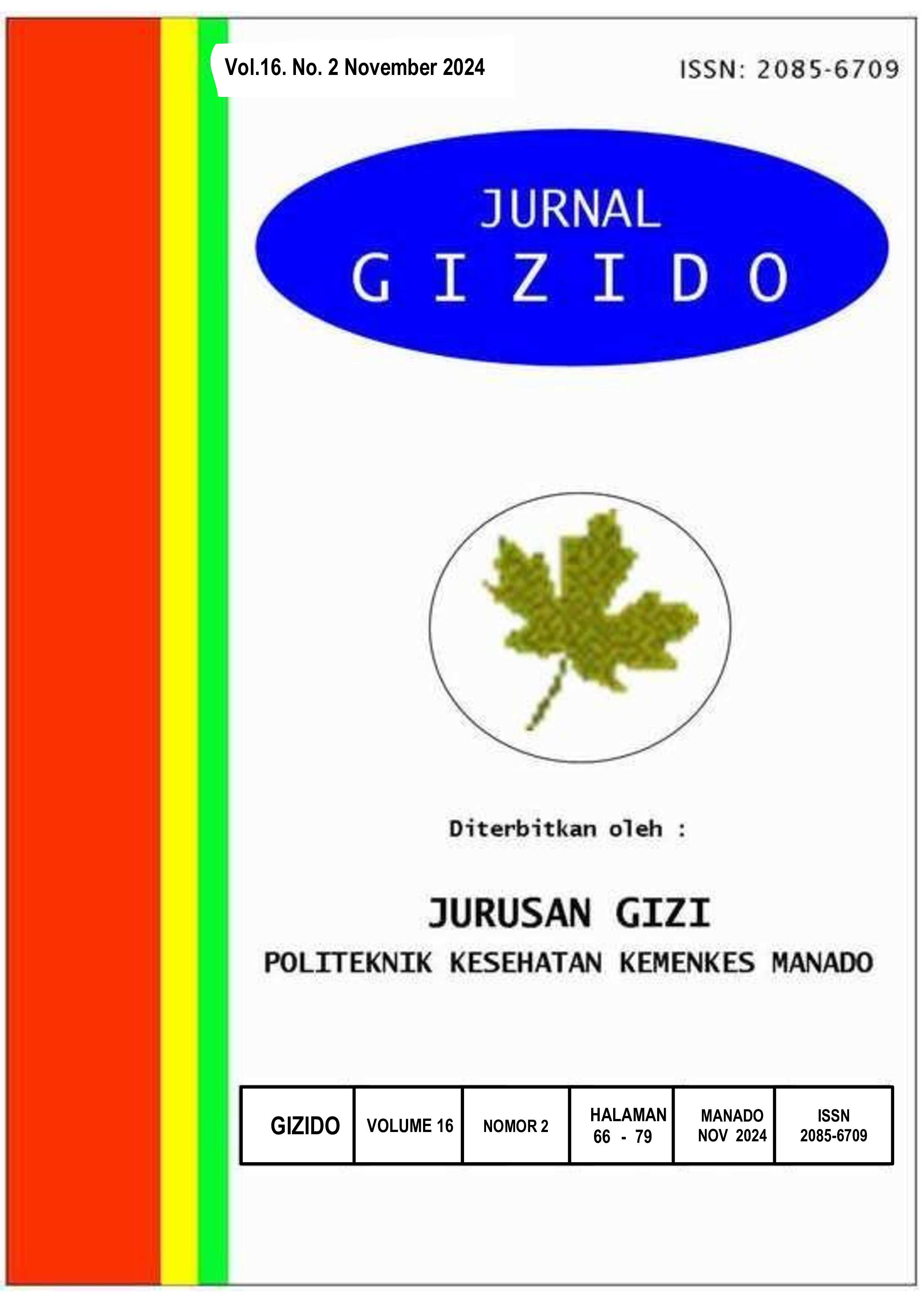 Jurnal GIZIDO merupakan media resmi yang diterbitkan oleh Jurusan Gizi Politeknik Kesehatan Kemenkes Manado, Terbit secara berkala dua kali setahun pada bulan Mei dan November. Penyunting menerima naskah yang bersifat ilmiah hasil penelitian atau studi pustaka yang materinya berkaitan dengan gizi, kesehatan dan pangan (gizi masyarakat, gizi klinik, gizi institusi dan pangan). Pedoman penulisan terdapat pada halaman belakang. Penyunting berhak merubah isi naskah sepanjang tidak bertentangan dengan pokok tulisan, sesuai dengan pedoman penulisan.ISSN : 2085-6709.e-ISSN : 2615-658X